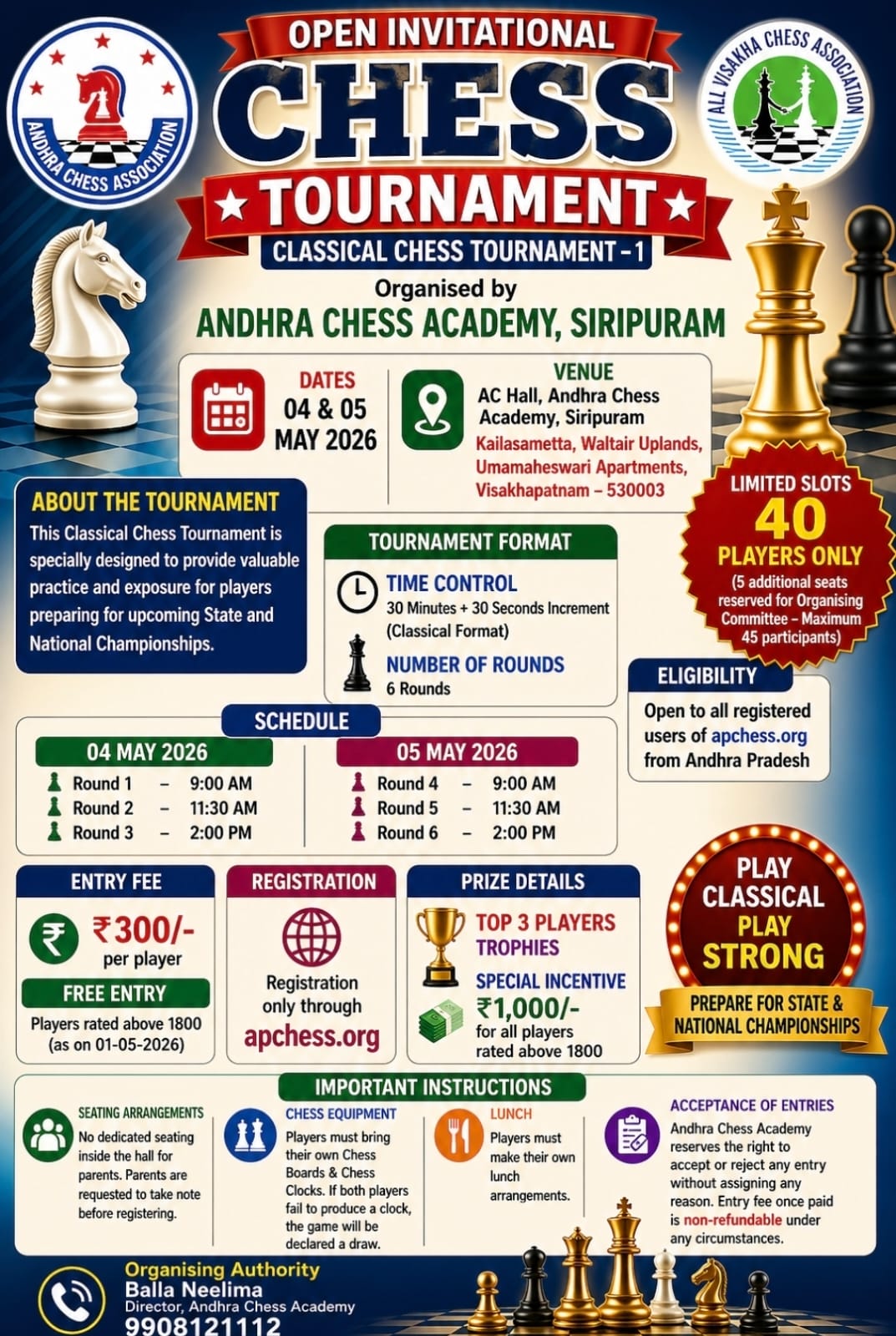 | May 04, 2026 | Download Prospectus | OPEN INVITATIONAL CLASSICAL CHESS TOURNAMENT - 1 | Click here | 14 Click here | 1 Click here | 0 Click here | Tournament gallery |